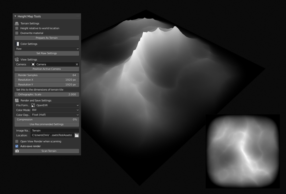 This Blender (2.8+) add-on streamlines the height map creation process within Blender. By a few button presses both the camera and terrain will be set up and render images to desired directories.